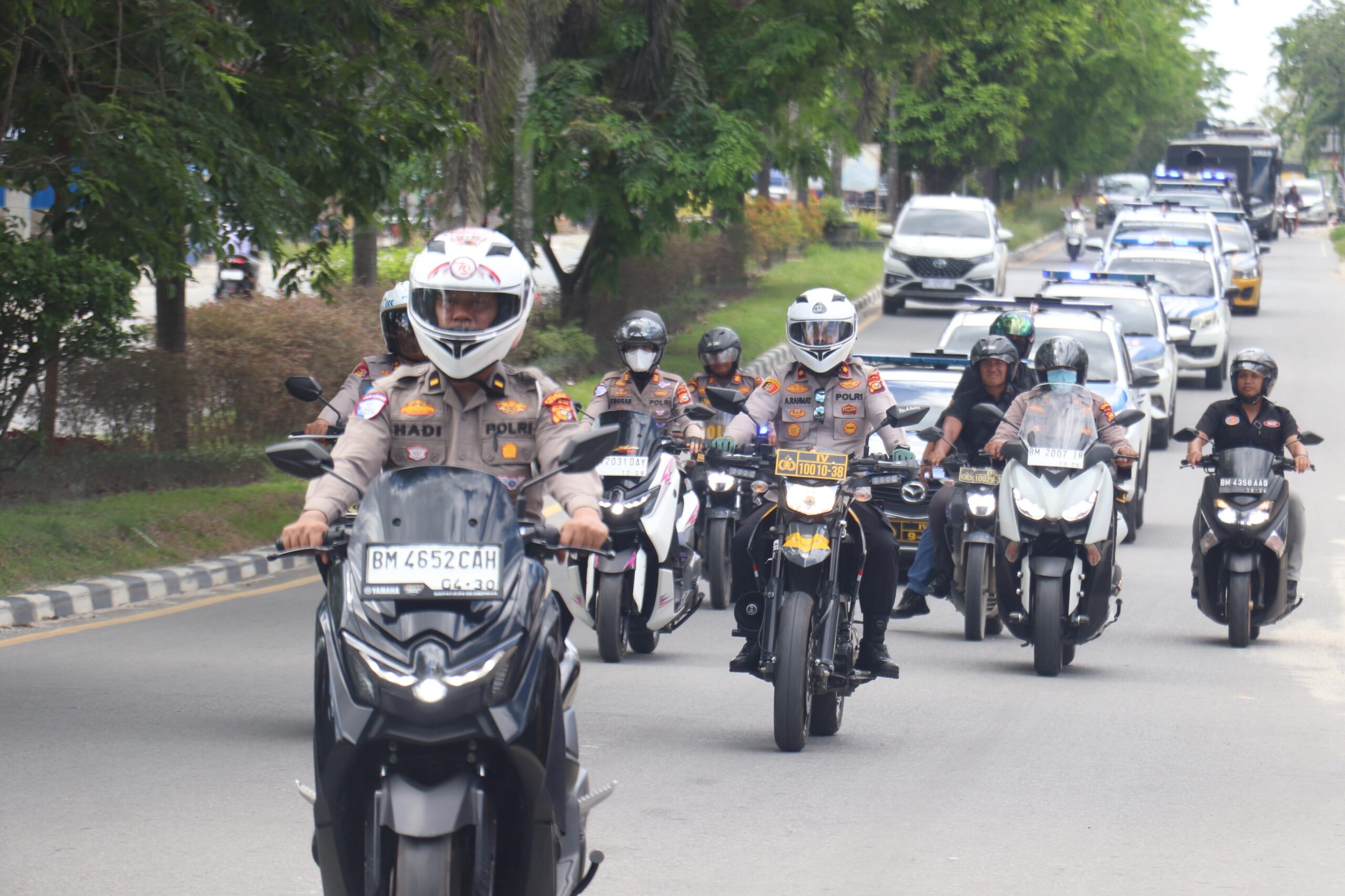 Pelalawan – Polres Pelalawan melaksanakan Patroli Skala Besar & Show of Force pada Minggu, 31 Agustus 2025, dalam rangka monitoring dan pantau situasi Kamtibmas antisipasi unras di wilayah Kabupaten Pelalawan. Kegiatan ini dipimpin langsung oleh Kapolres Pelalawan AKBP John Louis Letedara, S.I.K, didampingi oleh Wakapolres Pelalawan Kompol Asep Rahmat, S.H., S.I.K., M.M, dan Kabag Ops AKP H. Yulhairi, S.H., M.H.